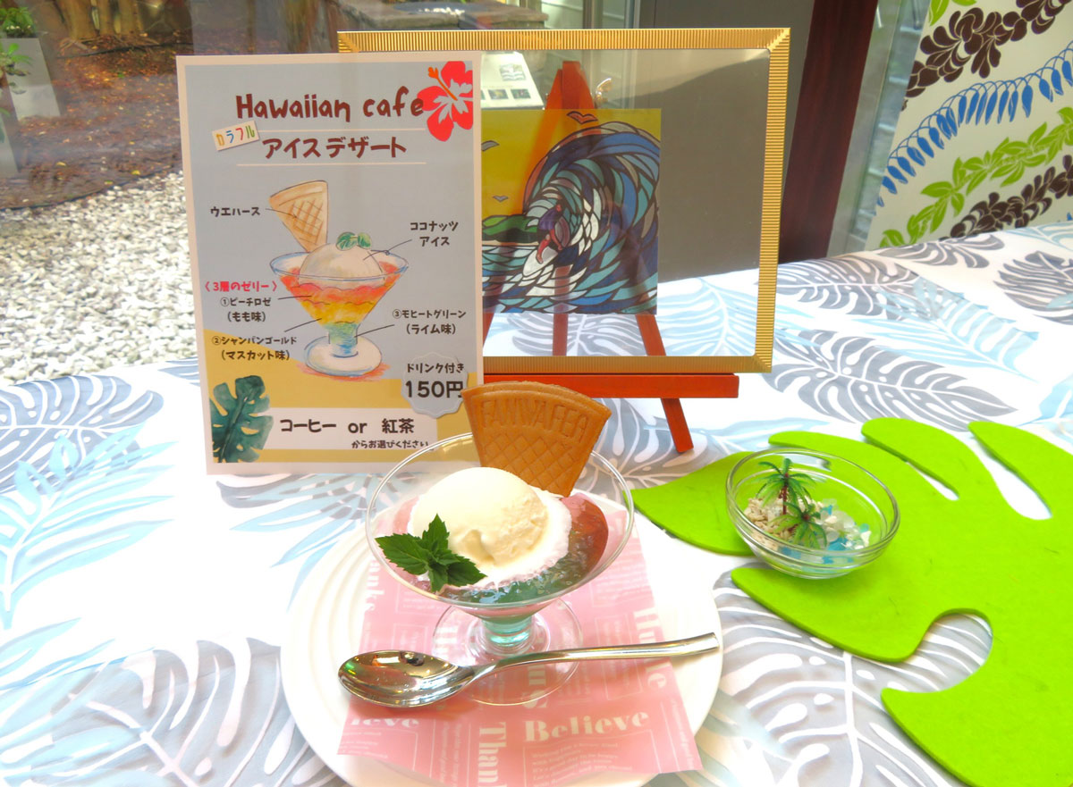 31日には、ハワイアン装飾のエントランスをカフェスペースにし、ミニアイスデザートをお楽しみいただきました。リゾートに出かけたような開放的なカフェタイムとなりました。 -