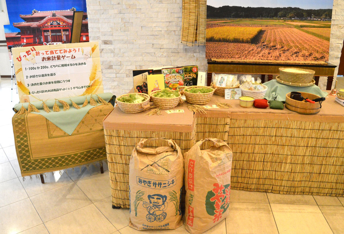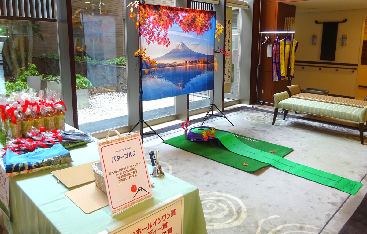 エントランスでは富士山に向かってパターゴルフ、東北のお米計量ゲーム、沖縄首里城を背景にフォト、鮮やかな京都友禅和紙を使用した一閑張りのトレーづくりと大盛り上がり!