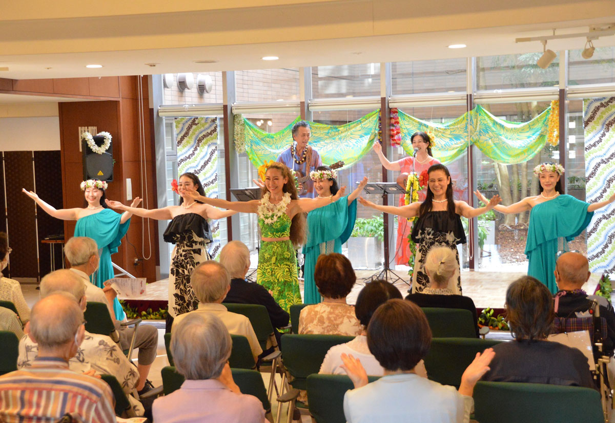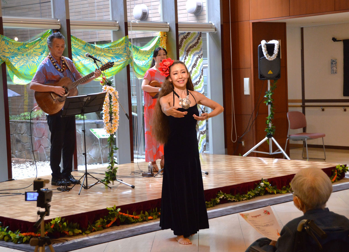 椎名さんの指先まで表現されるハワイアンラブソングにうっとりと、ウクレレ教室に参加されている居住者様とスタッフがステージに登り「バリバリの浜辺で」「Green Rose Hula」を演奏し、笑顔あふれるショータイムとなりました。 -