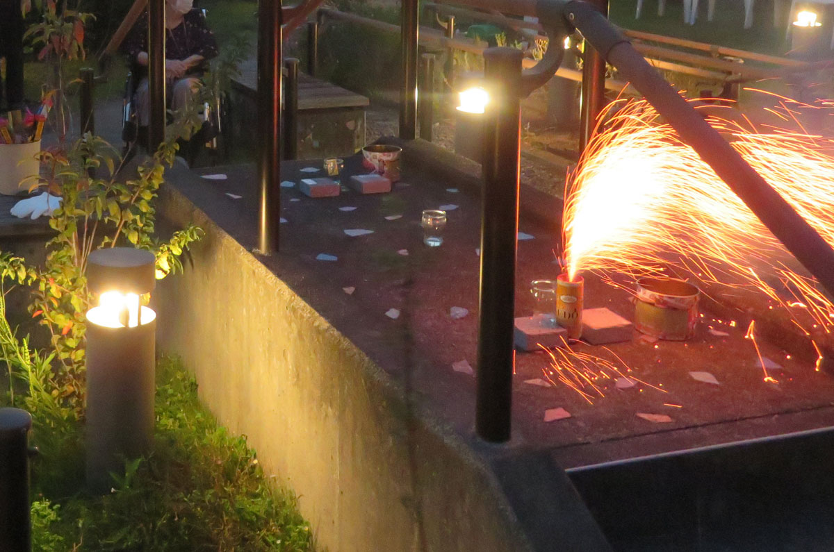 陽が落ちてからはささやきの庭で、花火を開催。たくさんの居住者様にご参加いただきました。 -