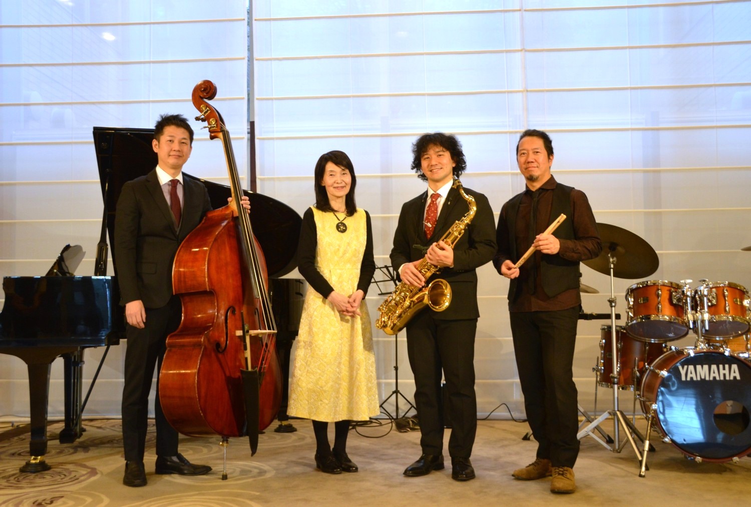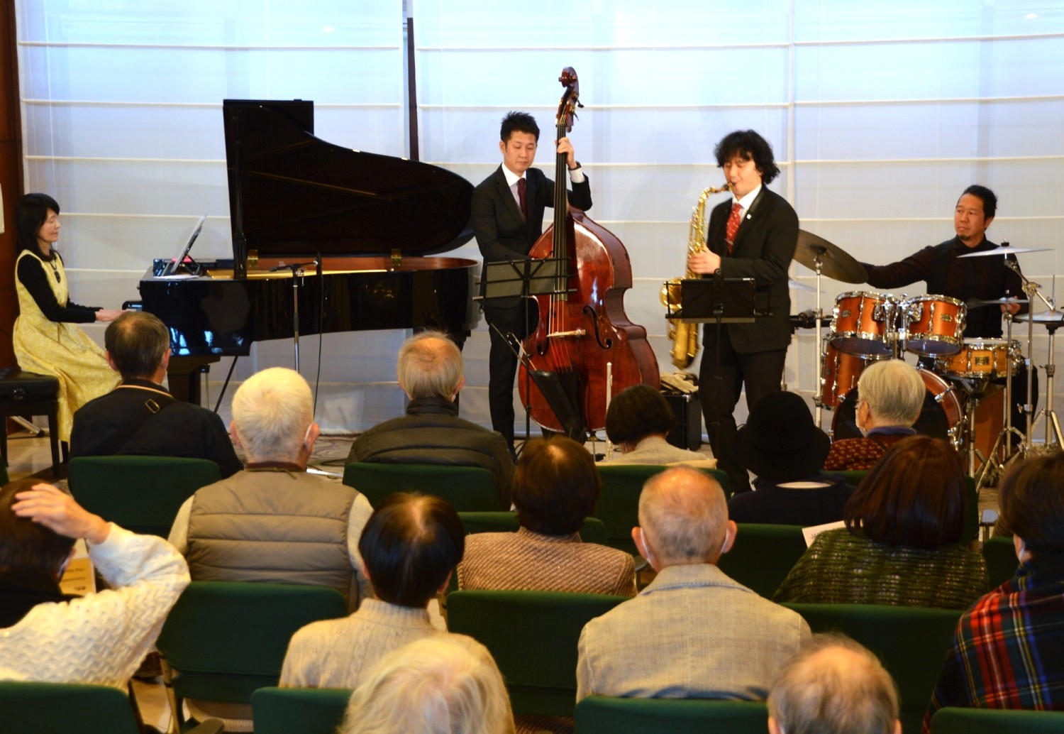 ピアノ、サックス、ウッドベース、ドラムを中心に、時々フルートの編成で、「薔薇色の人生」や「テネシー・ワルツ」など、曲が流行した当時の背景をMCで紹介しながら、全9曲を演奏いただきました。